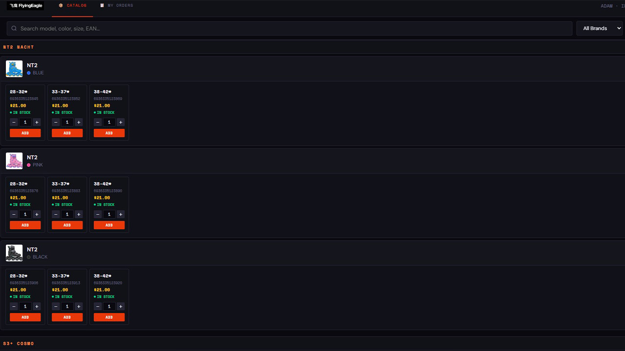 A B2B wholesale ordering portal for Flying Eagle inline skates, enabling distributors to browse catalogs, manage inventory, and place bulk orders.