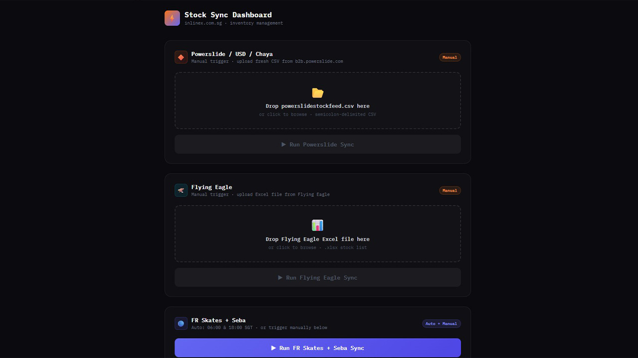 Automated inventory policy sync between three supplier stock feeds and Shopify, with a real-time web dashboard for manual triggers and live progress monitoring.