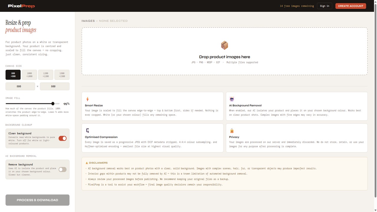 AI-powered product image resizer and background remover for e-commerce sellers. Bulk resize, smart canvas fitting, and AI background removal with one click.
