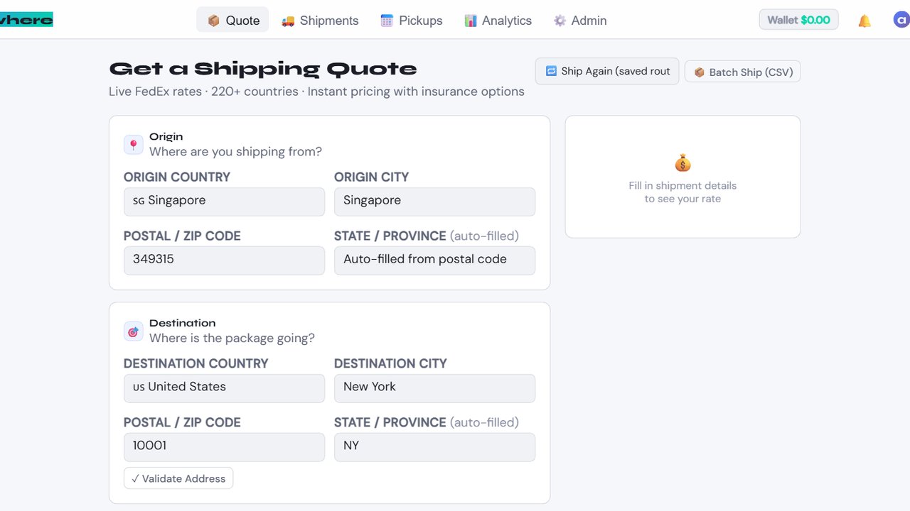 Smart international shipping platform offering up to 60% off FedEx rates, with instant quotes, one-click labels, electronic trade documents, and scheduled pickups to 220+ countries.